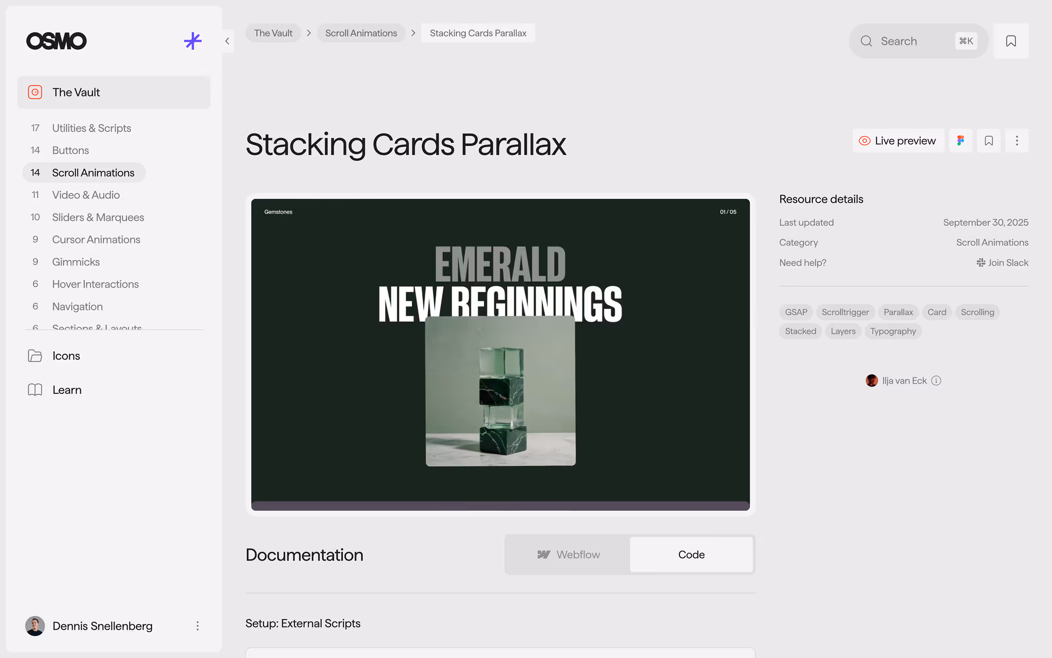 We’re not Webflow exclusive. Every resource in Osmo comes with full HTML/CSS & JS documentation, so you can easily adapt it to your workflow. Osmo is built for creative developers, whether you use Webflow, write code from scratch, or work somewhere in between.
